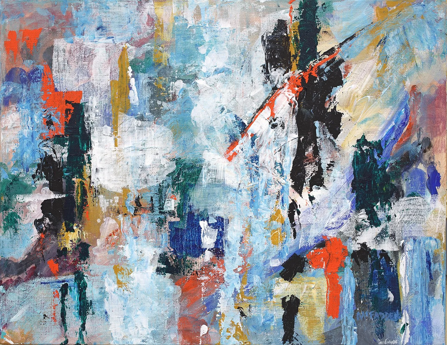 What started as a fun exercise in color and texture developed into a memory of walking in the rain in Brooklyn in the mid-70s. My abstracts very seldom start out with a specific direction in mind. Lots of the fun is finding out where the painting goes.